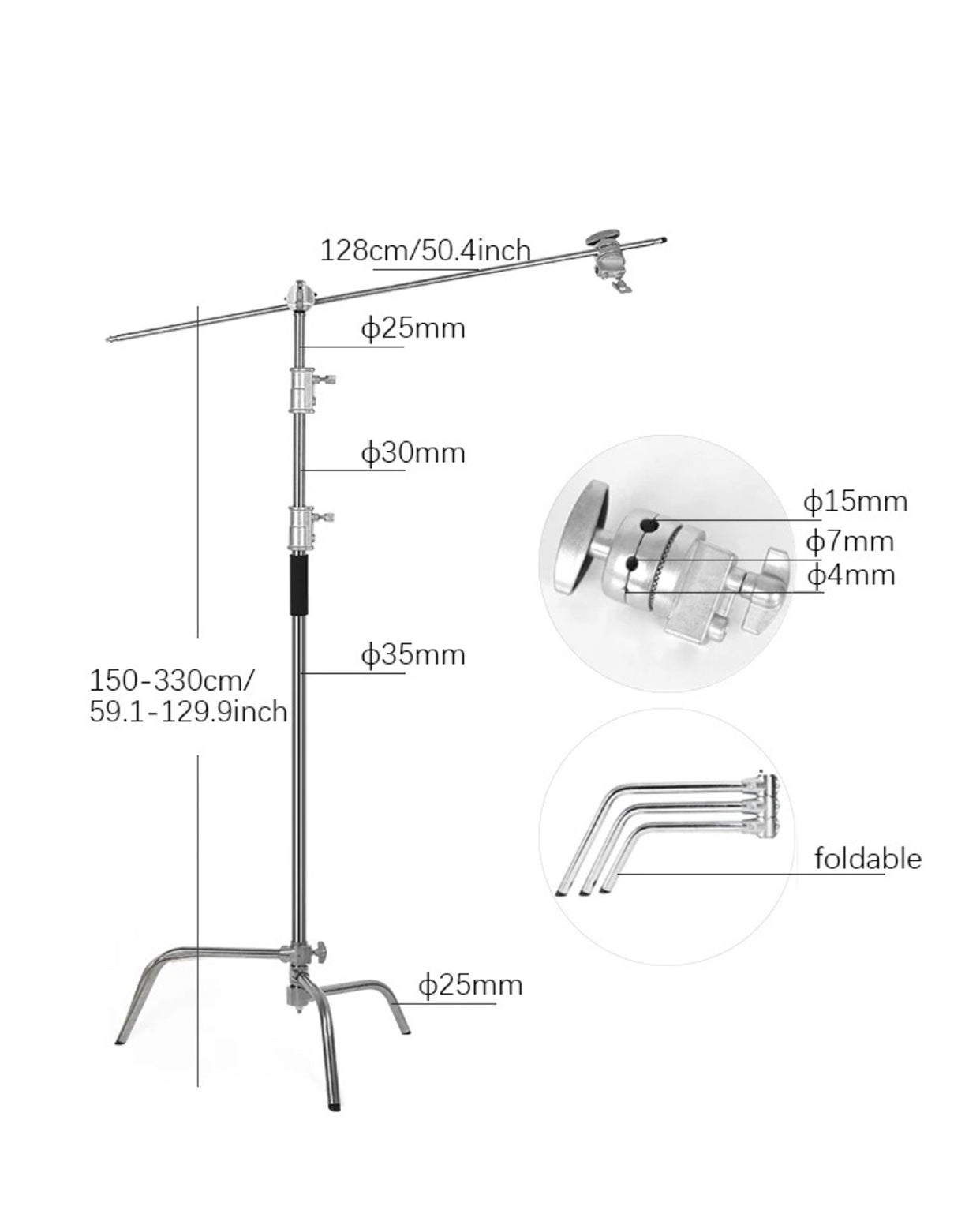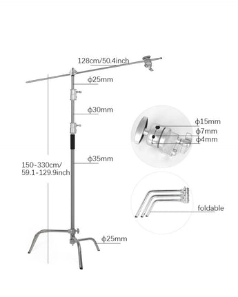 - Three-section center post tube diameter from 25~30~35mm. Adjustable height from minimum 105cm upto maximum height 210cm . The extension arm 16mm tube diameter, length 88cm with a 1/4” and 3/8” mounting screw on both ends is compatible with most equipment. The Air cushioned spring can reduce the impact caused by sudden drops.