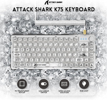 The K75 ATTACK SHARK Transparent Mechanical Keyboard delivers a perfect blend of style and performance. With its transparent housing, customizable RGB lighting, and high-quality mechanical switches, this keyboard is designed for gamers and typists seeking both aesthetic appeal and superior functionality.