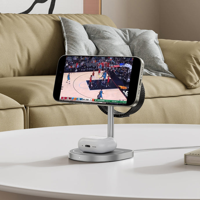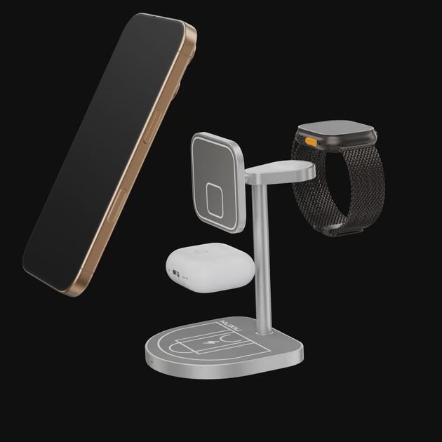 The KUXIU 3-Point Power Creative 3-in-1 MagSafe Charging Stand is a multifunctional charging solution designed for Apple device users. It combines efficient charging capabilities with a unique, basketball-inspired design, making it both practical and visually appealing for your workspace or bedside table.