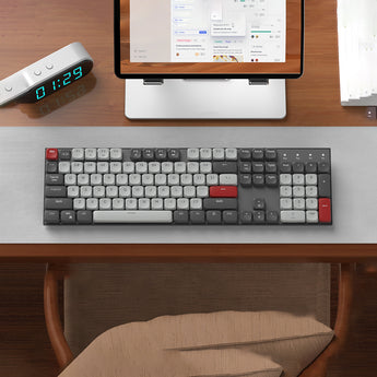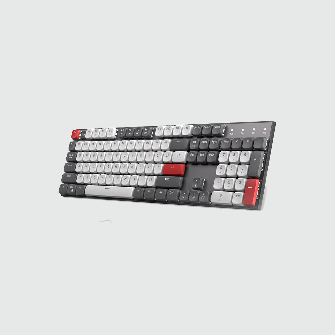 The MageGee MOON104 is a full-size wireless mechanical keyboard designed for both gaming and office use. Featuring ultra-slim keycaps and low-profile brown switches, it offers a comfortable and responsive typing experience. With tri-mode connectivity, customizable RGB backlighting, and a 3000mAh battery, the MOON104 combines functionality with portability.