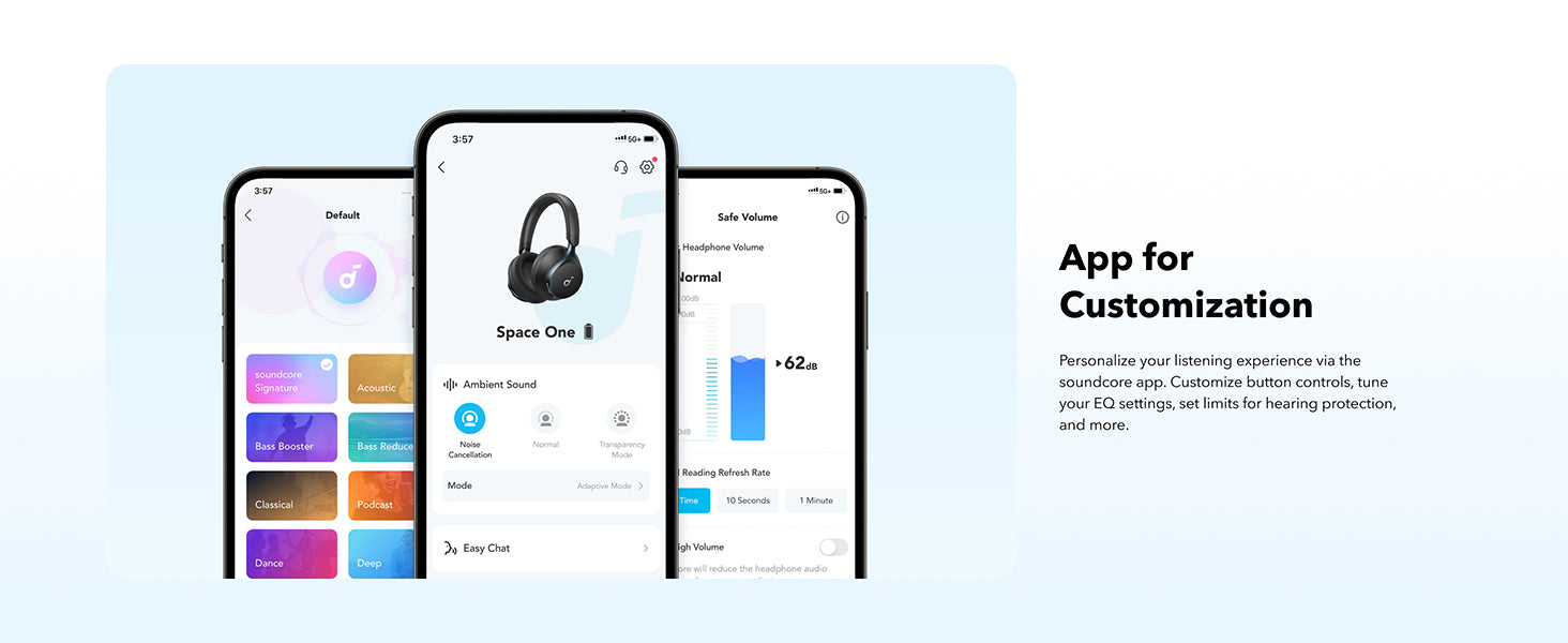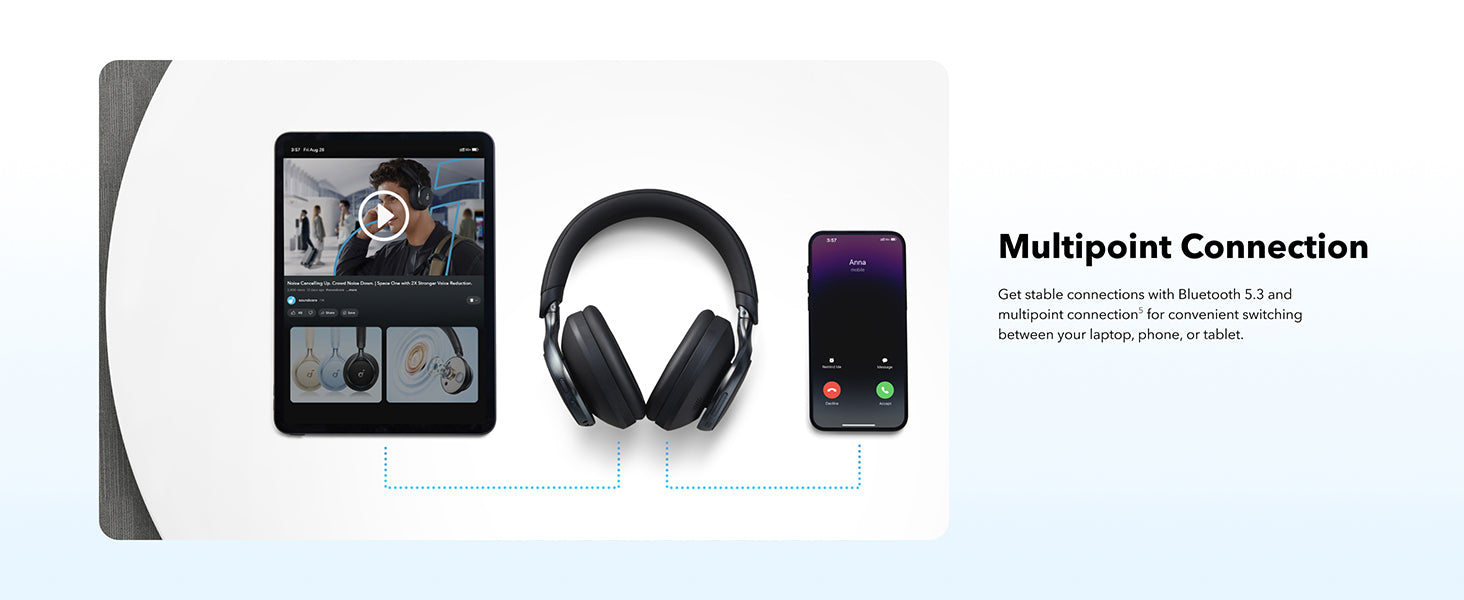 The Soundcore Space One Active Noise Cancelling Headphones are engineered to offer an immersive listening experience, combining cutting-edge noise cancellation technology with superior sound quality. Whether you’re traveling, working, or relaxing, enjoy your music in peace with high-end features and a comfortable fit.